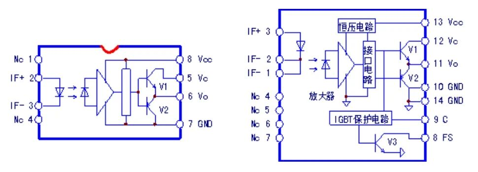 在變頻器驅動線路中,為了保證控制端和驅動端的電氣隔離,會使用光耦芯片作為控制信號轉驅動信號的耦合元件。其中,比較常見的光耦芯片有6腳,8腳,16腳幾種封裝,比如HCPL3150,HCPL316J,PC923,PC929,TLP350,TLP520,FOD3120等,其中16腳封裝的還集成了管壓降檢測功能,下面以PC923,PC929為例,介紹一下光耦芯片的作用和功能。